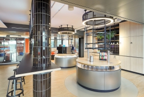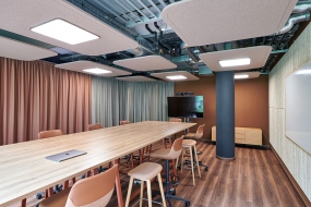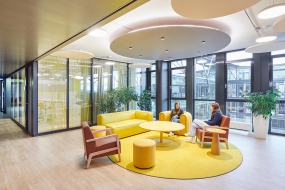无论地面是选择地砖或是木地板材质,颜色与花色选择都很多样化,我们在选择地面的颜色时,要考虑到与墙面和办公室颜色的协调性才行。通常我们会选择明度与墙面(或家具)相同或者稍低的地面颜色,为办公室环境营造踏实、沉稳的感觉,而不会有虚浮的感受。