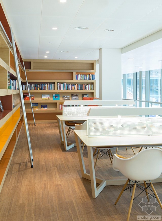 在大楼的进门处,人们可以通过那个三层楼高的休息大堂,看到建筑内的大致状况,一架复杂的楼梯将所有的楼层都联系起来。这里的主色调是中性的亮色,包括白色的墙壁、天花板、家具以及浅色的木质地板,这一切都让整个空间显得无比温暖。空间里的一些地方好像被溅上去的蓝色、黄色和绿色斑点,又恰到好处的打破了整体那种简洁的略显沉闷的浅色,给这里带来一丝有趣和俏皮的动态感。