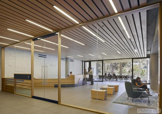 用桉树板材和木条做成的条带状墙面,起始于接待处的桌子那里,进而围绕着光亮的主入口,延伸到整个区域。弯曲的墙体隔出了长凳区、酒吧区和休息区。大厅的天花板是用隔音的桉木做成的,然后在投资者会谈室那里,天花板又变成了动态的平面形状。与柔软温暖的木质元素不同,办公室的其他区域,则采用的是金属做成的网状天花板,还有灰色的带斑点地毯。